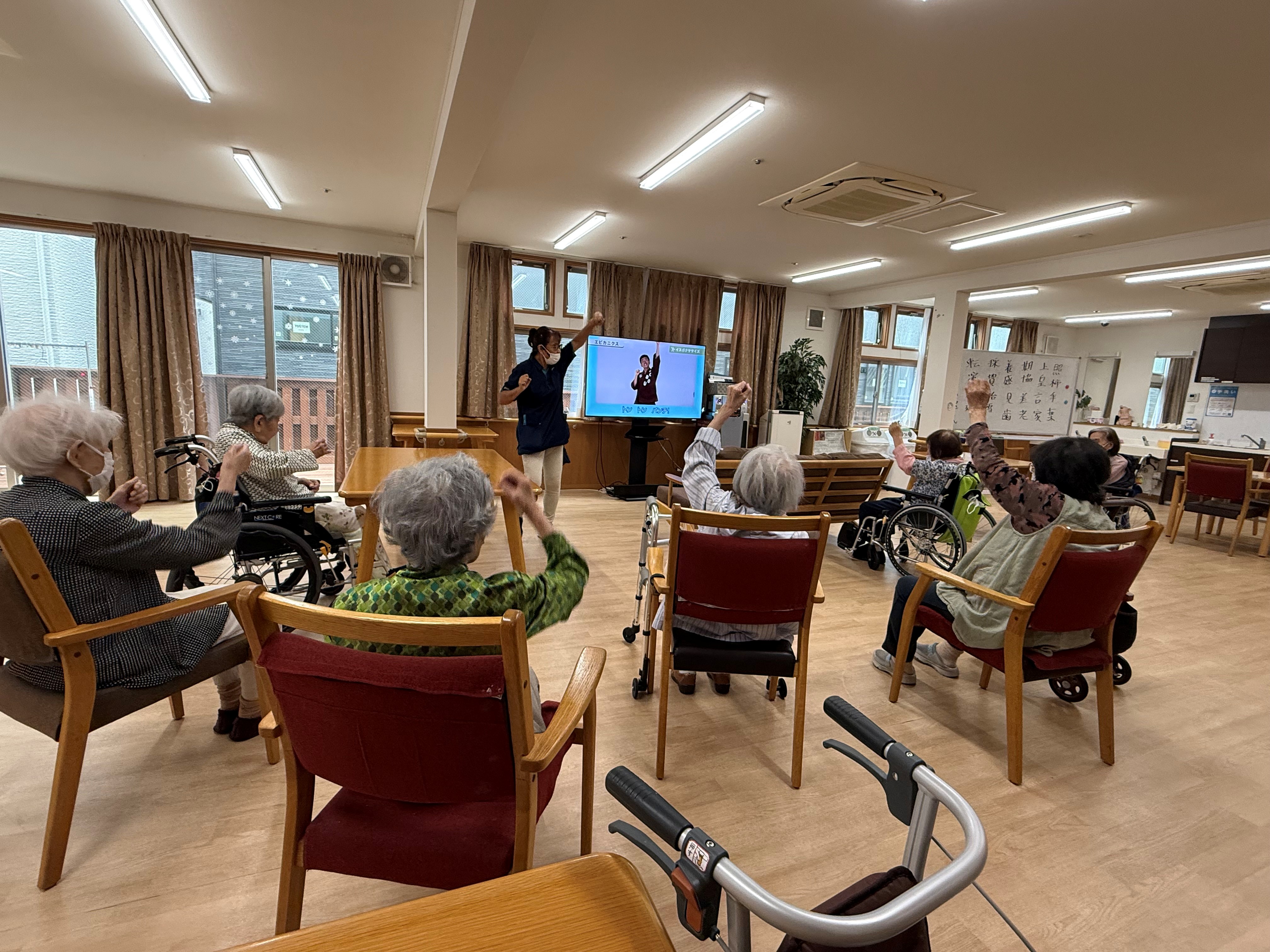 全国の介護施設で大人気!ごぼう先生の明るい声掛けに合わせて「ごぼう先生の健康体操」をご利用者様と一緒に声を出しながら元気に行います。